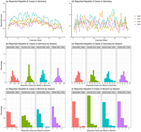Reported cases of hepatitis A and E infections in Germany between 2020 and 2023. The left column shows trends in the number of HEV cases reported each week in Germany between 2020 and 2023, with case numbers plotted over time in Panel (a) (Table S1), by season for all of Germany in Panel (b), and by season for Munich only in Panel (c). During the years with lockdown periods (2020–2022), we generally saw lower numbers of reported cases than in 2023. Throughout each year, there is a noticeable seasonal pattern: Reported cases tend to drop towards the end of each year and rise in spring/summer. The right column shows the corresponding trends for Hepatitis A, with case numbers plotted over time in Panel (d) (Table S2), by season for all of Germany in Panel (e), and by season for Munich only in Panel (f). The colors in (b,c,e,f) represent the different seasons. Red indicates spring, green summer, blue autumn, and purple winter. See Supplementary Tables S1 and S2 for detailed numbers [15].