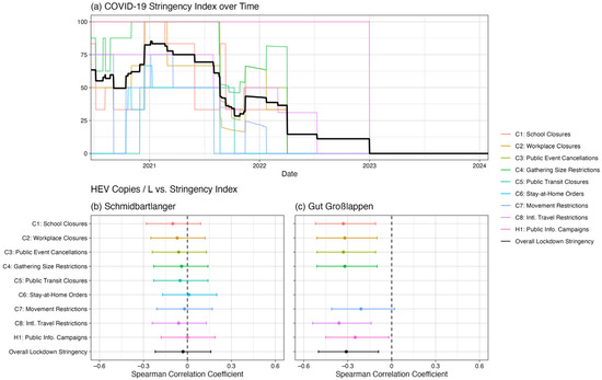 Correlations between HEV concentrations and lockdown stringency. Spearman correlation coefficients (with 95% confidence intervals) are plotted for the correlations between the overall COVID-19 Stringency Index (a), as well as its individual components, and the normalized HEV concentrations for Schmidbartlanger (b) and Gut Grosslappen (c). Dashed lines denote a Spearman correlation coefficient of zero.