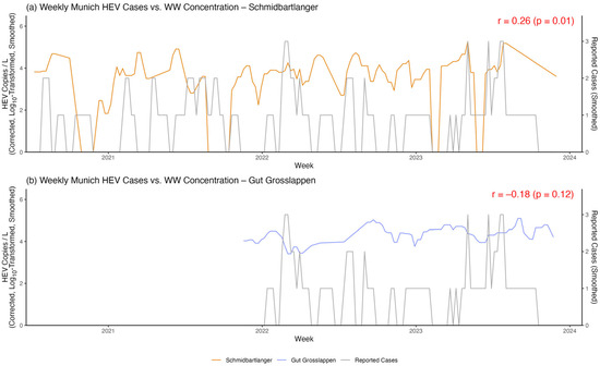 Overall, HEV notification data and wastewater concentrations were fairly evenly distributed over time. There was a small but significant positive correlation between the mean HEV concentration per week measured at Schmidbartlanger and the corresponding total number of cases in Munich, with r = 0.26 (p = 0.01), as shown in Figure 6a. For Gut Grosslappen, statistically significant correlations between wastewater measurements and cases were not observed, with r = −0.18 (p = 0.12), as shown in Figure 6b.