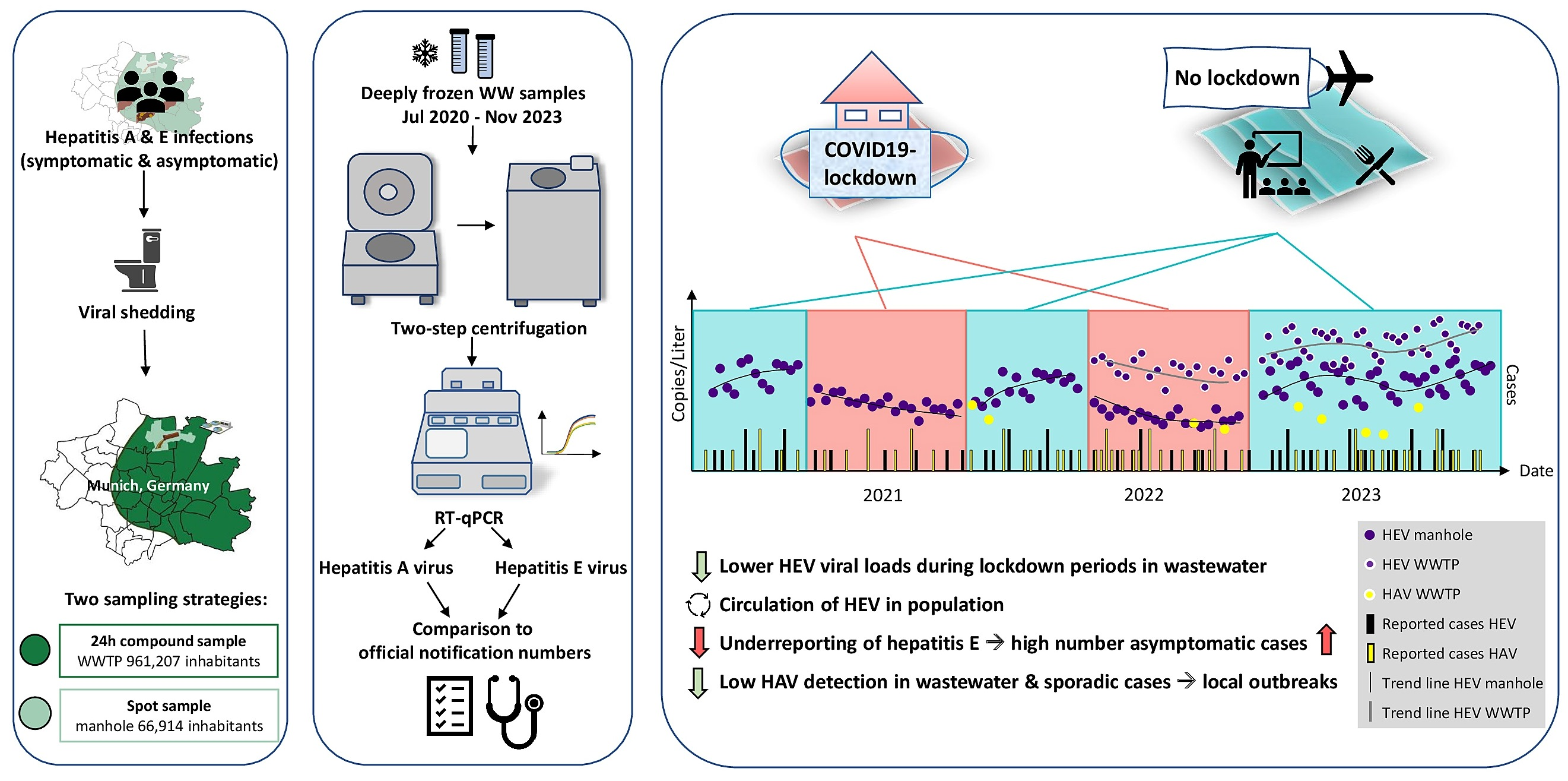 Figure 2). Additionally, from November 2021 to November 2023, 75 twenty-four-hour composite wastewater samples were collected at the Gut Grosslappen treatment plant in Munich. All samples were tested for HAV and HEV, enabling an evaluation of WBE’s effectiveness in detecting these pathogens and identifying any changes associated with the lockdown and post-lockdown periods.