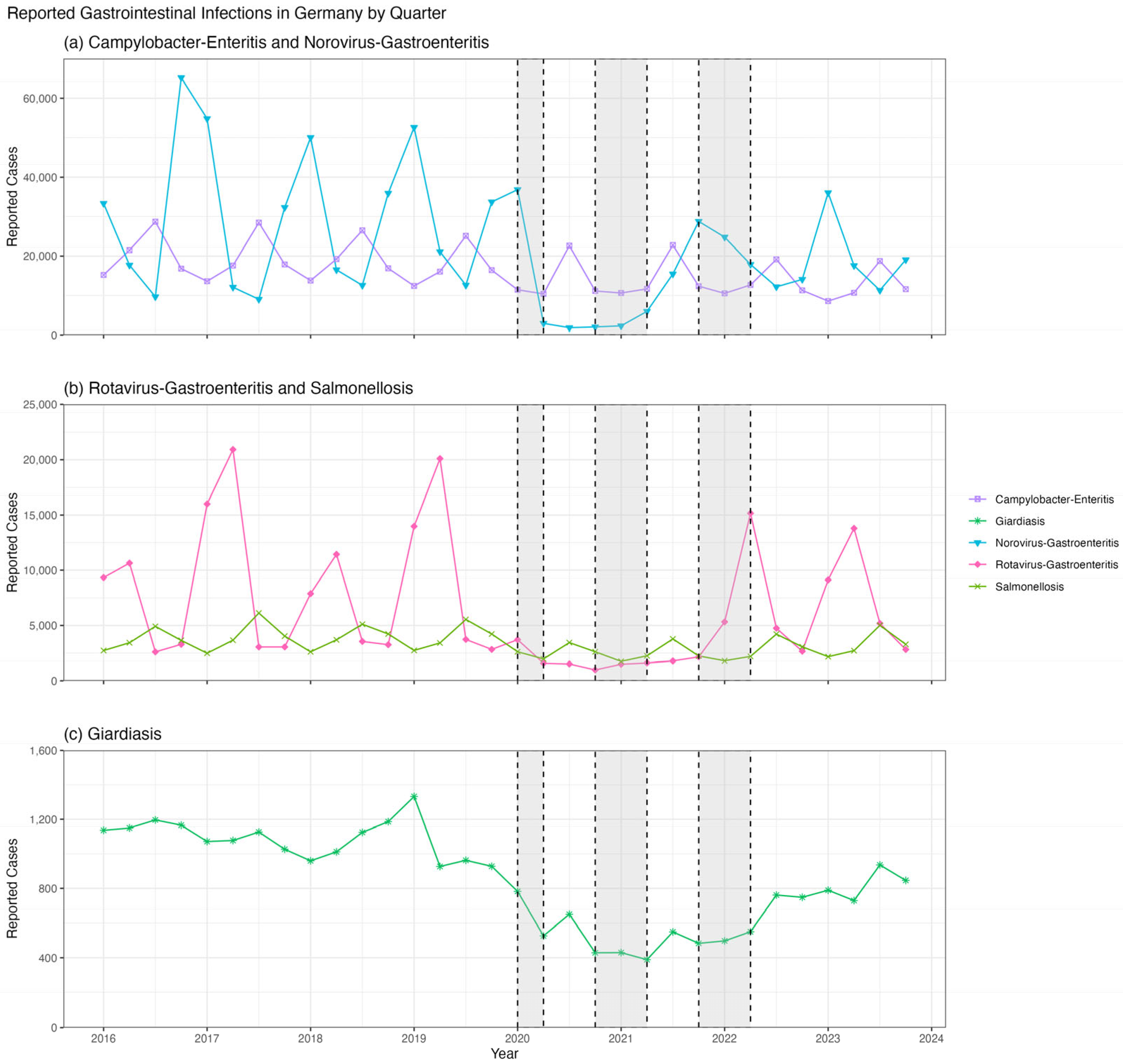 Figure 3a). Reported HEV cases evince a seasonal pattern both throughout Germany (