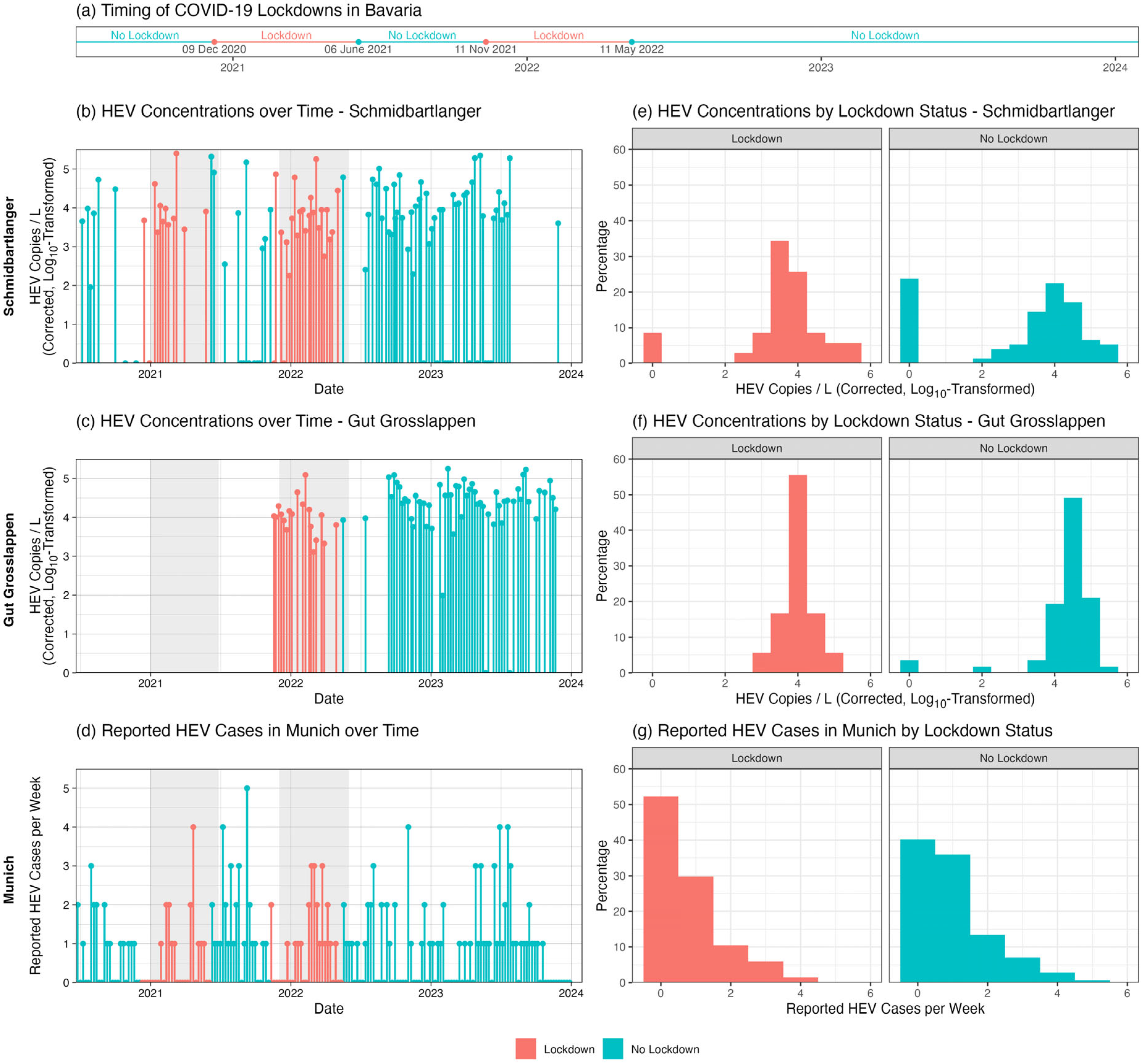 Figure 4b,e, this pattern of differences by lockdown status did not hold for Schmidbartlanger, where the mean HEV concentration was roughly the same regardless of lockdown status: 2.2 × 10