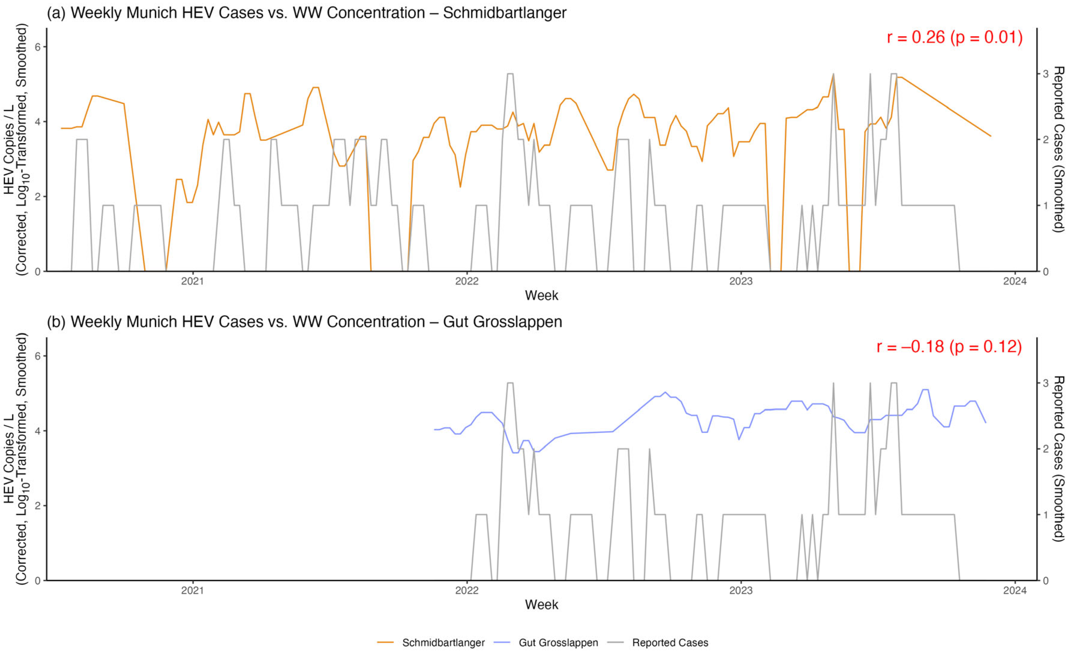 Overall, HEV notification data and wastewater concentrations were fairly evenly distributed over time. There was a small but significant positive correlation between the mean HEV concentration per week measured at Schmidbartlanger and the corresponding total number of cases in Munich, with r = 0.26 (
