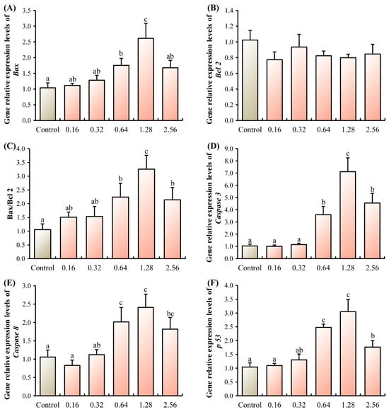 ANTX-a exposure triggered a significant upregulation in the mRNA level of the pro-apoptotic gene Bax at concentrations of 0.64 and 1.28 µg/L relative to the control group (p < 0.05, Figure 1A). A similar increasing trend was observed for the Bax/Bcl-2 ratio and the transcript levels of Caspase 3, Caspase 8, and p53 in all treatment groups from 0.64 to 2.56 µg/L. These indicators peaked at the 1.28 µg/L exposure level, showing a marked elevation compared to controls (p < 0.05, Figure 1C–F).