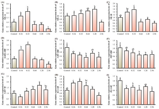 Effects of ANTX-a on the mRNA expression levels of neurotransmitter receptor-related genes of juvenile E. sinensis. (A–C) NR, N-methyl-D-aspartate receptor; (D) GABA 2BR, γ-aminobutyric acid type B receptor subunit 2; (E–G), 5-HT, serotonin receptor; (H,I) DA, dopamine receptor. Different letters shown above the columns represent significant differences (p < 0.05).