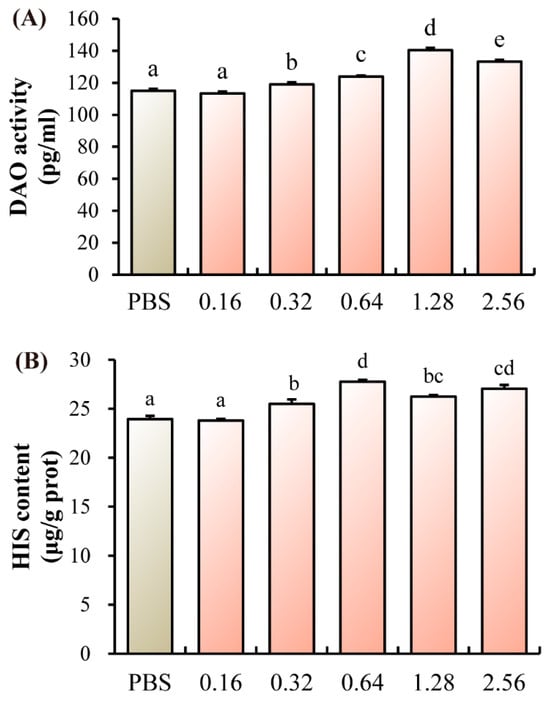 Relative to the control group, a significant elevation in both DAO activity and HIS content was observed in all treatment groups ranging from 0.32 to 2.56 µg/L (p < 0.05, Figure 3A,B).