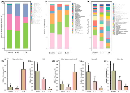 Analysis of the microbial composition at the phylum level indicated that Proteobacteria, Firmicutes, and Bacteroidetes were the predominant phyla across the Control, 0.32, and 1.28 µg/L groups (Figure 4A). Notably, the relative abundance of Vulcanimicrobiota was significantly elevated in the 1.28 µg/L group compared to both the control and 0.32 µg/L groups (p < 0.05, Figure 4D). At the class level, Gammaproteobacteria, Bacteroidia, and Bacilli were the most common classes (Figure 4B), while the abundance of Clostridia was significantly depleted in the 1.28 µg/L group relative to the control (p < 0.05, Figure 4H). At the genus level, Enterobacterales, Shewanella, and Acinetobacter showed increased abundance and became dominant in the 1.28 µg/L group (Figure 4C). One-way ANOVA identified a significant reduction in the abundance of both Vibrio and Tyzzerella (p < 0.05, Figure 4E,G). Of particular note, the abundance of Clostridium sensu stricto 1 was significantly lower in the 1.28 µg/L group than in the control group (p < 0.05, Figure 4F).