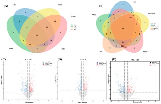 Effects of ANTX-a on thoracic ganglia transcriptome different-expressed genes (DEGs) of juvenile E. sinensis. (A) Venn diagram of coding potential prediction by four tools (CNCI, CPC2, CPAT, PLEK); (B) Venn diagram of functional annotation of novel transcripts against five databases (NR, KEGG, GO, eggNOG, SwissProt); (C) Volcano plot showing DEGs in C group vs. 0.32 group; (D) Volcano plot showing DEGs in C group vs. 1.28 group; (E) Volcano plot showing DEGs in 0.32 group vs. 1.28 group.
