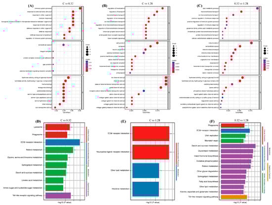 Effects of ANTX-a on thoracic ganglia transcriptome pathways of juvenile E. sinensis. (A) GO enrichment analysis of C group vs. 0.32 group; (B) GO enrichment analysis of C group vs. 1.28 group; (C) GO enrichment analysis of 0.32 group vs. 1.28 group; (D) KEGG enrichment analysis of C group vs. 0.32 group; (E) KEGG enrichment analysis of C group vs. 1.28 group; (F) KEGG enrichment analysis of 0.32 group vs. 1.28 group.