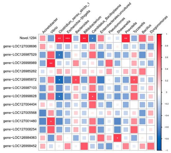 Integrative analysis of the correlation between microbiome and transcriptome in juvenile E. sinensis. The heatmap displays Pearson correlation coefficients. Red indicates a positive correlation, and blue indicates a negative correlation. Asterisks (*), (**), (***) denotes a statistically significant correlation p < 0.05, p < 0.01 and p < 0.001, respectively.
