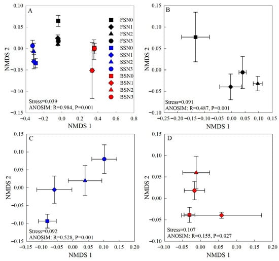 Non-metric multidimensional scaling ordination for bacterial communities from 48 soil samples for all soils (A), FS (B), SS (C), and BS (D) based on Bray–Curtis dissimilarities (mean + se, n = 4). Significant differences in sample clustering are measured by ANOSIM.