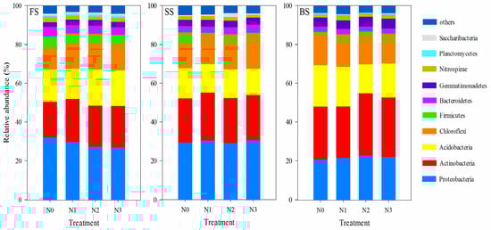 Generally, FS, SS, and BS soils had similar primary phyla under different N treatments. The dominant phyla were Proteobacteria, Actinobacteria, Acidobacteria, Chloroflexi, Firmicutes, Bacteroidetes, Gemmatimonadetes, Nitrospirae, Planctomycetes, and Saccharibacteria (>1%) (Figure 3). The relative abundances of the top five phyla (Proteobacteria, Actinobacteria, Acidobacteria, Chloroflexi, and Firmicutes) accounted for 84.2–85.8% and 85.4–86.4% in FS and SS, and the top five phyla (Actinobacteria, Proteobacteria, Acidobacteria, Chloroflexi, and Gemmatimonadetes) accounted for 87.9–89.4% in the BS. The impact of N fertilization on the relative abundance of bacterial phyla differed across various soil types. In the SS, the N application led to a marked decline in the relative abundance of Firmicutes but a significant increase in that of Saccharibacteria compared with the N0 treatment. However, in FS and BS, different N treatments did not cause marked differences in the relative abundance of the predominant phyla. Meanwhile, we also analyzed the effects of N application on the genus level (Figure S1). For FS soil, Bacillus was the dominant genus across all N treatments, and RB41, Streptomyces, and Sphingomonas also contributed to the community composition, but their relative abundances varied among treatments. In the SS soil, Sphingomonas was the most prominent genus, and its abundance increased with the increase in N application rate. Similar to FS, other genera like RB41, Streptomyces, and Nocardioides were present, but Thiobacillus occurs only in SS. Regarding BS soil, RB41 was the dominant genus; Gaiella, Streptomyces, and Rubrobacter showed distinct patterns of relative abundance changes with varying N levels. Overall, N application treatments influenced the relative abundance of bacterial genera in the three soil types, though the specific response patterns differed among soils, reflecting the heterogeneity in soil microbial community responses to N input.