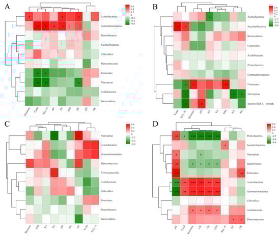 Pearson’s correlation heatmap between bacterial communities and soil properties in FS (A), SS (B), BS (C), and three soils (D). R-values are displayed in different colors, as indicated by the color code on the right of the heatmap. Significance levels are denoted by * p < 0.05, ** p < 0.01, and *** p < 0.001.