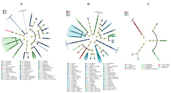 Cladogram showing the phylogenetic distribution of the bacterial lineages associated with soil from the four N treatments in FS (A), SS (B), and BS (C). The taxa with absolute LDA scores over 3 and p-values less than 0.05 are shown. Circles indicate phylogenetic levels from phylum to genus. The diameter of each circle is proportional to the abundance of the group.