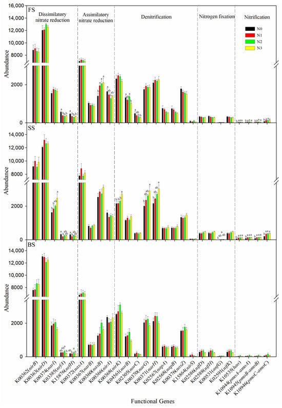 Elucidating the soil N-cycling process is significant for improving N use, decreasing N loss, and further increasing crop yield. Long-term inorganic N fertilization led to high levels of nitrate and ammoniacal N, encouraging the proliferation of denitrifying bacteria and causing N loss in soil [,]. Various nitrogen cycle processes are mediated by specific functional genes that are crucial for their respective functions. These include nifH for nitrogen fixation, amoA/B for nitrification, narG, napA, nirK/S, and nosZ for denitrification, as well as nirB/D and nrfA/H for dissimilatory nitrate reduction []. In general, N addition had a negative [] or no significant influence [] on the abundance of the nitrification genes. However, our results showed that N fertilizers significantly increased the abundance of some nitrification genes (hao, pmoA-amoA, pmoB-amoB, pmoC-amoC) in FS and SS. Similar results were noted by Liu et al. [], who discovered a notable increase in the abundance of the hao gene following the application of urea and demonstrated a significantly stronger association with the level of nitrogen present in the soil, probably due to higher soil N concentrations, which alleviates the competition for nutrients between autotrophic and heterotrophic nitrifying microbes []. This can partially explain the reason of soil NO3−-N content significantly increased in N applied treatments. Denitrification, a microbially facilitated process, reduces nitrate and nitrite to nitric oxide (NO), nitrous oxide (N2O), and nitrogen (N2), playing a crucial role in the transformation of the nitrogen cycle. N fertilizer significantly increased the abundance of denitrification encoding genes (nirK, narG, narH) in SS. In line with previous studies in semiarid regions, which observed the abundance of narG, nirK, nirS, and nosZ genes increased significantly following N application rates [], likely because of the increased N availability due to N addition, provided considerable NO3−-N as the substrate of denitrification []. The present study further supported previous studies that N fertilization increases the abundance of N functional genes [], particularly evident is the nitrification and denitrification [,]. It should be noted that PICRUSt2 predictions rely on the completeness and representativeness of the reference database and cannot capture functional traits of uncultured or poorly represented taxa in the database. To validate and refine these functional inferences, complementary approaches, such as shotgun metagenomics or metatranscriptomics, would be valuable in future studies.