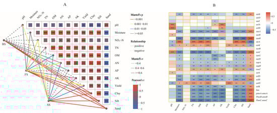 (A) The bacterial community composition of three soils based on Bray–Curtis distance is related to each edaphic factor by the Mantel test. The width of the line represents the partial Mantel’s r statistic, and the color of the line denotes the statistical significance based on 999 permutations. The pairwise correlation of environmental factors is shown by Pearson’s correlation coefficient with a color gradient, and straight and dashed lines represent positive and negative correlations, respectively. (B) Correlation between N-cycling function and edaphic factors and wheat yield. Colors represent Spearman correlations. Asterisks indicate the significance level: * p < 0.05, ** p < 0.01, *** p < 0.001.