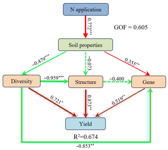 PLS-PM (Figure 8) showed N application significantly altered soil properties (pH, NO3−-N), and these soil property changes were statistically linked to wheat yield via associated shifts in soil bacterial community diversity, structure, and functional genes. Specifically, N application exhibited a strong statistical association with soil characteristics (0.772, p < 0.001), with NO3−-N being the primary driver of this association. Soil properties negatively correlated with bacterial diversity (−0.479, p < 0.001) and positively associated with functional gene abundance (0.355, p < 0.01), with N fixation-related gene (anfG) being the most responsive functional gene groups. Bacterial diversity showed a marked negative correlative relationship with community structure (−0.959, p < 0.001). Structural factors significantly promoted yield (0.873, p < 0.01), whereas both diversity (0.721, p < 0.05) and genetic factors (0.519, p < 0.01) also exerted a positive effect on yield. The model explained 67.4% of yield variation and had a goodness-of-fit (GOF) of 0.605. These results highlight that N-induced soil changes are correlatively connected to yield through associated shifts in microbial traits.