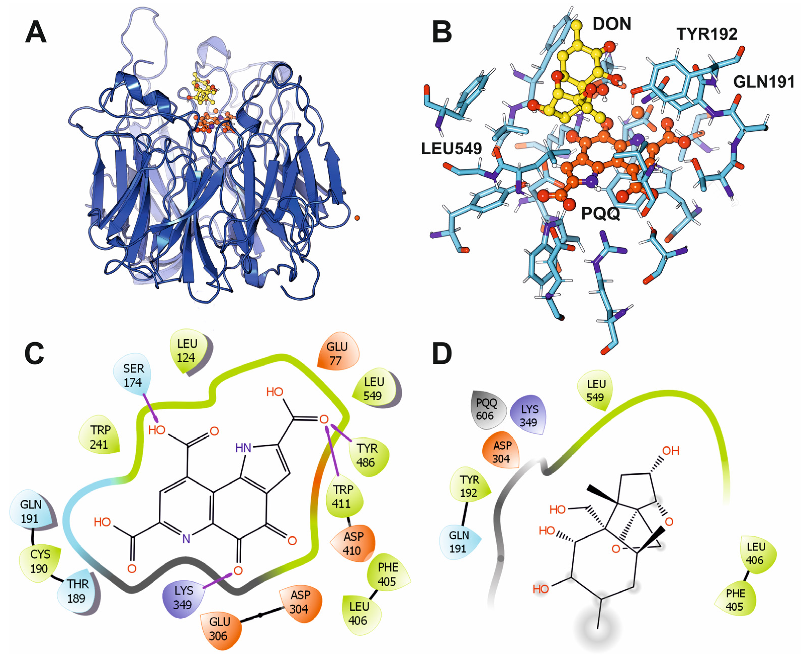 - Yang, H.; Yan, R.; Li, Y.; Lu, Z.; Bie, X.; Zhao, H.; Lu, F.; Chen, M. Structure-Function Analysis of a Quinone-Dependent Dehydrogenase Capable of Deoxynivalenol Detoxification. J. Agric. Food Chem. 2022, 70, 6764–6774. [Google Scholar] [CrossRef]