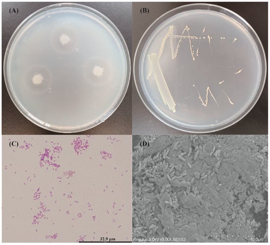 After growing on marine basal medium plates containing 0.5% alginate at 30 °C for 48 h, V. sp. 32415 was treated with 1 M CaCl2 solution, and a transparent circle presented around the colonies (Figure 1A), indicating that 32415 could produce extracellular alginate lyase. On Zobell 2216E plates, V. sp. 32415 presented as neat-edged, milky white, circular colonies (Figure 1B). Its cells were Gram-negative (Figure 1C), aerobic, flagellum-free, non-motile, and curved, approximately 0.3–0.5 μm in width and 1.5–1.8 μm in length (Figure 1D).