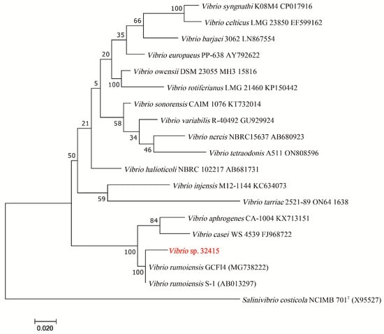A Maximum Likelihood phylogenetic tree was constructed using MEGA 7.0.26 to determine the evolutionary position of V. sp. 32415. The sequence information used for tree construction is listed in Table S1. The tree-building model includes HKY+G+I, Gamma 2, and 1000 bootstrap replications. Salinivibrio costicola NCIMB 701T was used as the outgroup [22].