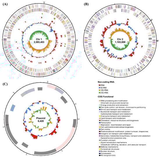 Genome map of V. sp. 32415. (A) Chromosome 1. (B) Chromosome 2. (C) Plasmid. The circles from the outer to the inner: Circle 1: the size of the genome. Circle 2 and 3: the CDS on the positive and negative strands, respectively, with different colors indicating the different COG functional classifications of the CDS. Circle 4: rRNA and tRNA. Circle 5: the GC content, with the outward red part indicating that the GC content of this region is higher than the average GC content of the whole genome. Circle 6: the GC skew value.