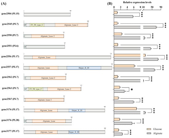Analysis of the gene conserved domain and expression level of the alginate lyase in V. sp. 32415. (A) Conserved domain of alginate lyase. SP: Signal peptide. (B) Expression level of the alginate lyase gene after 24 h of cultivation. * p < 0.05, *** p < 0.001.