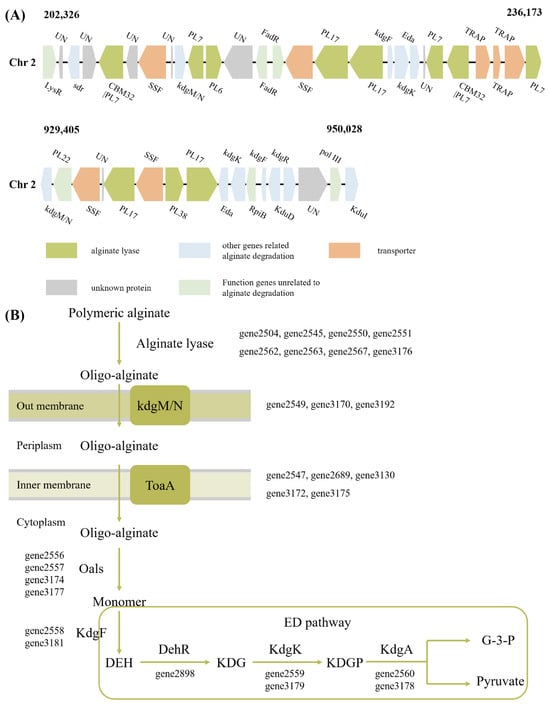 Degradation and utilization pathways of alginate in V. sp. 32415. (A) Alginate utilization loci of V. sp. 32415. (B) Alginate metabolic pathway of V. sp. 32415. LysR: transcriptional regulator, sdr: short-chain dehydrogenase/reductase, KdgR: transcriptional regulator KdgR, pol III: DNA polymerase III epsilon subunit, KduD: 2-deoxy-D-gluconate 3-dehydrogenase, KduI: predicted 4-deoxy-L-threo-5-hexosulose-uronate ketol-isomerase, KdgM/N: oligogalacturonate-specific porinin, ToaA/SSF: sodium-solute symporter, Oals: oligo-alginate lyases, KdgF: pectin degradation protein, DehR: 4-deoxy-L-erythrohexoseulose uronicacid reductase, kdgK: 2-dehydro-3-deoxygluconokinase, KdgA: 2-keto-3-deoxy-6-phospho-gluconate aldolase, DEH: 4-deoxy-L-erythro-hexoseulose uronic acid, KDG: 2-keto-3-deoxy-D-gluconate, KDPG: 2-keto-3-deoxy-6-phospho-gluconate, G-3-P: glyceraldehyde-3-phosphate.