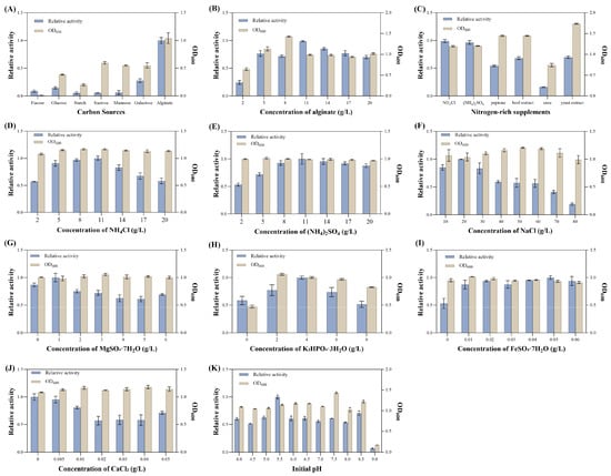Effects of different factors on the growth and enzyme production of V. sp. 32415. (A) Carbon sources. (B) Alginate concentration. (C) Nitrogen-rich supplements. (D) NH4Cl concentration. (E) (NH4)2SO4 concentration. (F) NaCl concentration. (G) MgSO4·7H2O concentration. (H) K2HPO4·3H2O concentration. (I) FeSO4·7H2O concentration. (J) CaCl2 concentration. (K) Initial pH.