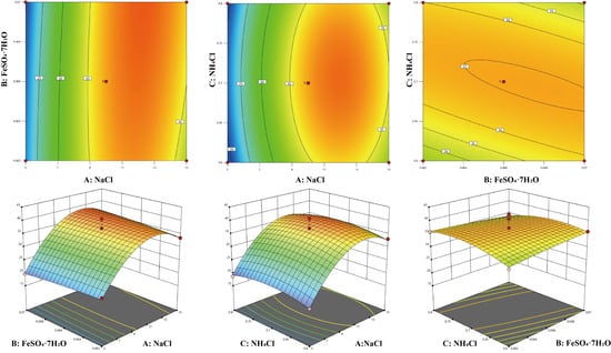 Contour plots and three-dimensional response surface plots can be used to describe the relationship between variables and response values. Using Design-Expert 13.0 software, the response surface analysis plots of AB, AC, and BC in the regression equation were drawn (Figure 7). In the response surface plots, a convex surface indicates that there is a maximum point between two factors, which also indicates that there is a maximum enzyme activity point in the experiment. In the contour plots, an elliptical shape indicates a significant interaction between two factors. From the amplitude of the response surface curve changes, it can be seen that the steepness of the NaCl concentration is the greatest, indicating that it has the most significant effect on the enzyme production of the strain, followed by NH4Cl and FeSO4·7H2O. This result is consistent with the analysis in Table S7.