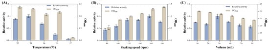 Effects of fermentation conditions on strain growth and enzyme production. (A) Temperature. (B) Shaking speed. (C) Liquid loading volume.
