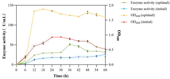 After optimizing the components of the culture medium and fermentation conditions, the enzyme activity and strain biomass clearly increased. It began to enter the stable growth phase after 12 h, 12 h earlier than the original conditions. In terms of enzyme production, the optimized enzyme activity reached the highest of 51.062 U/mL, which was 2.8 times that of the original 18.176 U/mL (Figure 9). The shortening of the fermentation time reduced the risk of contamination by miscellaneous bacteria, decreased the probability of potential economic losses, and also reduced the time cost. It has potential application value in industrialization [42].