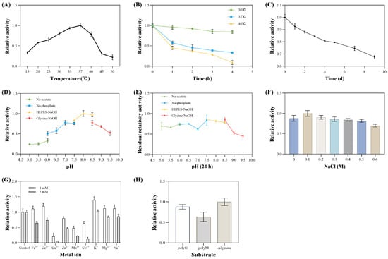The enzymatic properties of the extracellular alginate lyase from V. sp. 32415 were analyzed and characterized. The extracellular enzyme exhibited the highest activity at 37 °C. Within the temperature range of 20–40 °C, the enzyme activity was at least 50% of its maximum value. When the temperature exceeded 45 °C, the enzyme activity decreased rapidly (Figure 10A). Since most alginate lyases are derived from marine microorganisms, their optimal temperatures are mostly concentrated in the range of 30–40 °C [43,44]. However, some alginate lyases show cold adaptation or heat resistance. For example, the optimal temperature of alyRm3 from Rhodothermus marinus is 75 °C, and after incubation at 70 °C for 16 h, the remaining activity was 40% [45]. In contrast, the optimal temperature of TAPL7B was 20 °C, and the activity decreased rapidly when the temperature exceeded 35 °C [46].