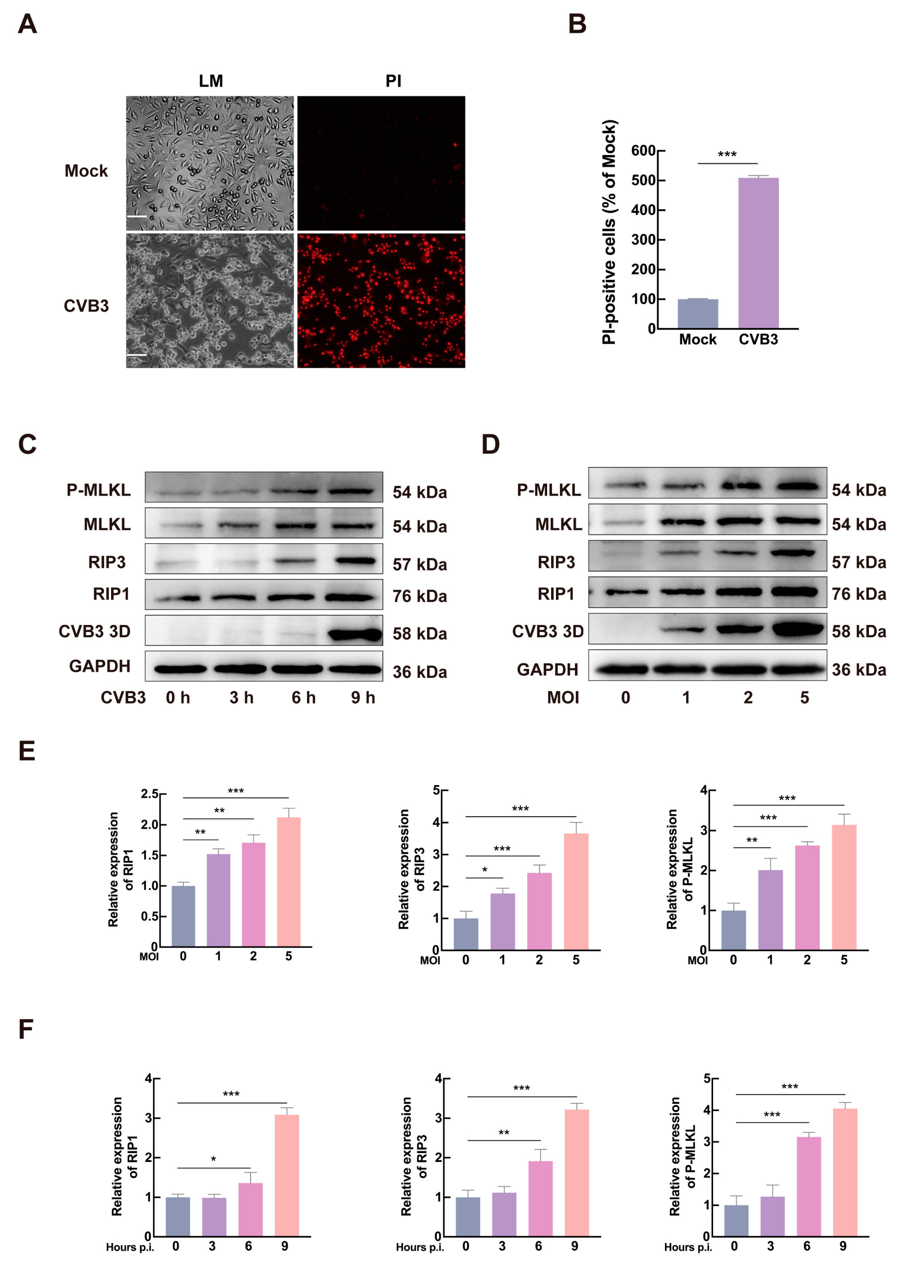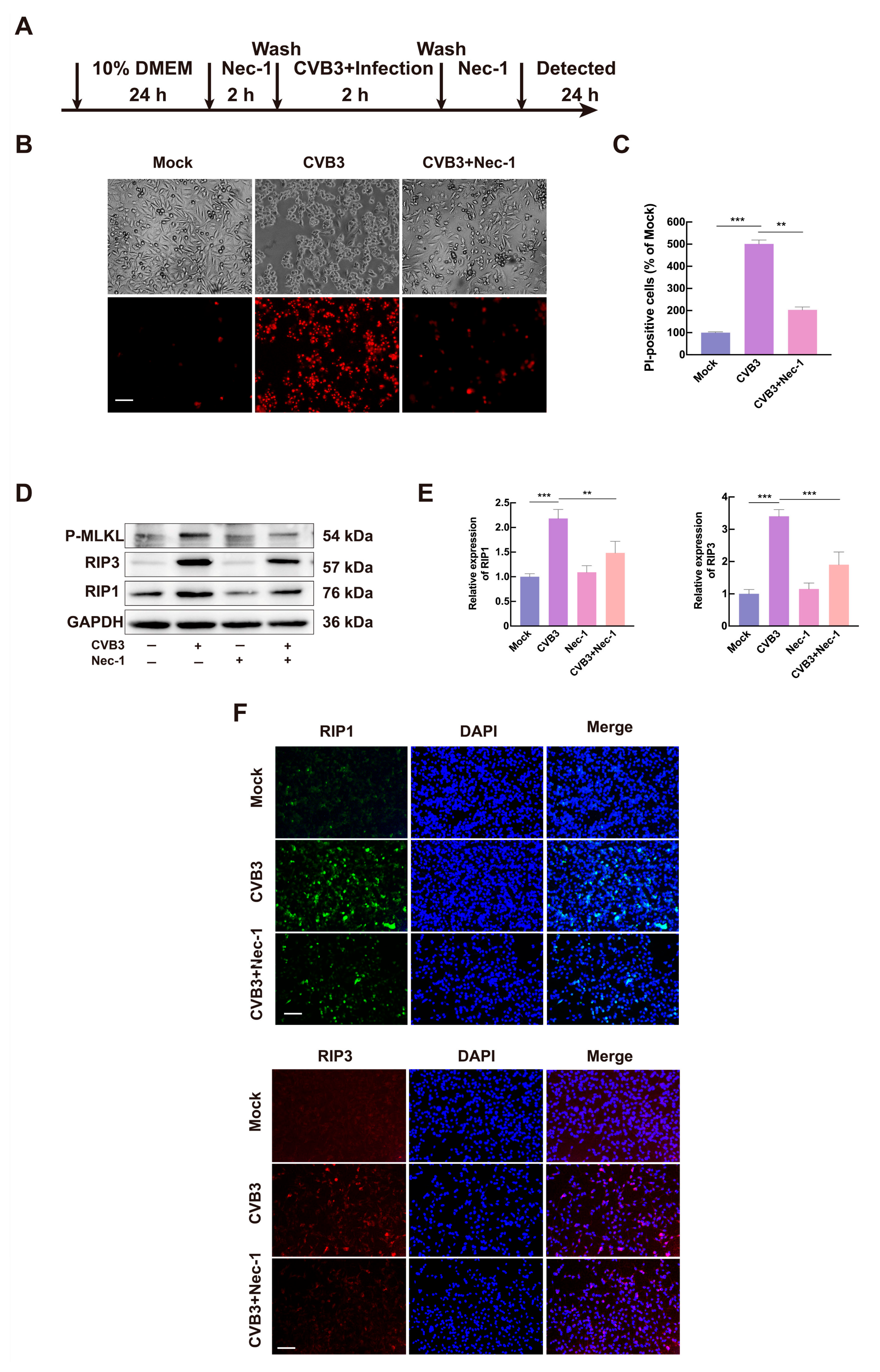 3.2. CVB3 Induces Necroptosis via the RIP1/RIP3 Pathway