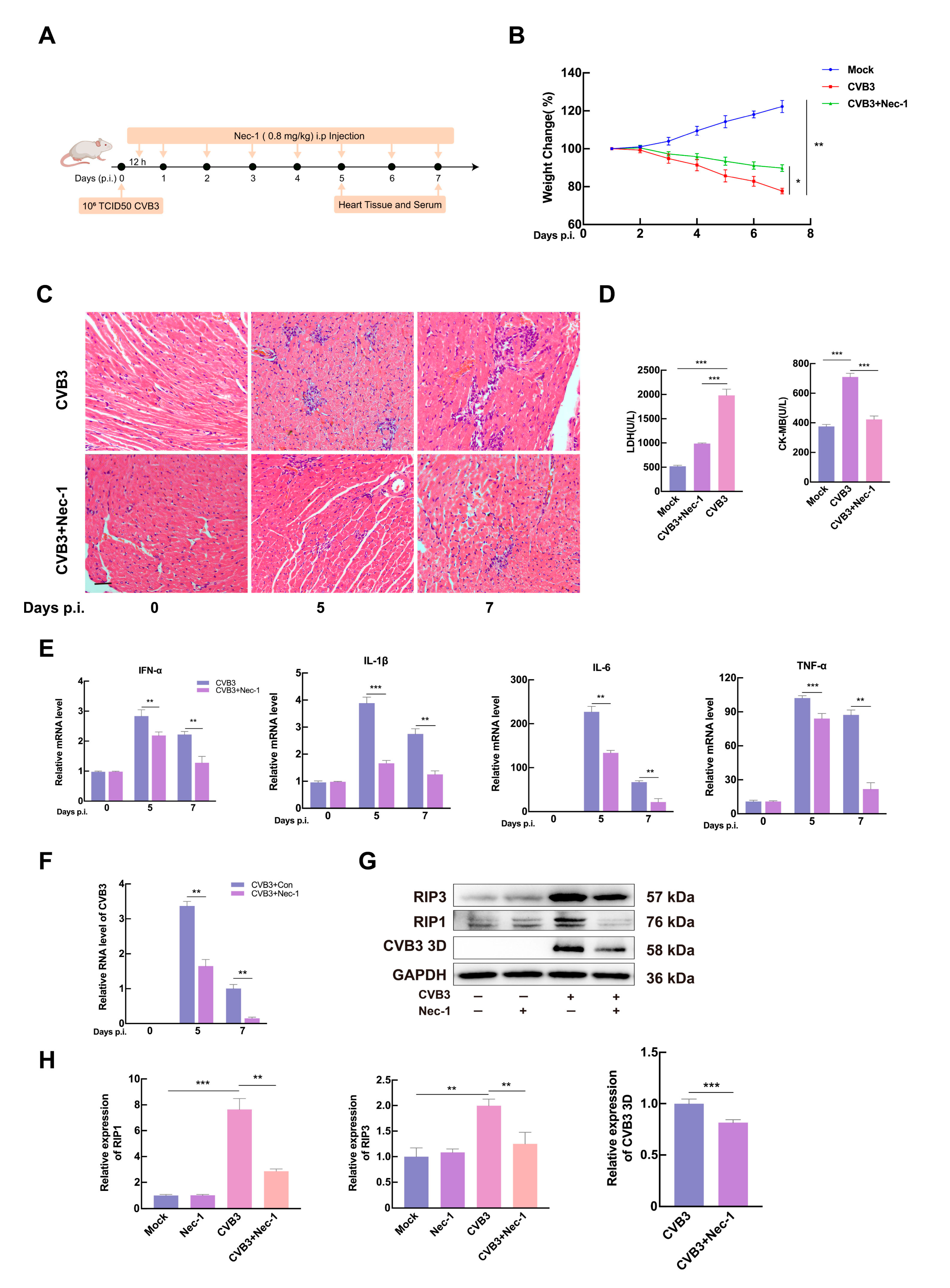 3.4. Inhibition of CVB3-Induced Necroptosis Reduces Viral Replication and Ameliorates Myocardial Injury In Vivo