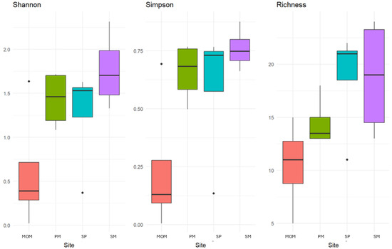 Shannon and Simpson indices and richness analysis of four sites at Essex Wildlife Trust, Grays Gorge (Sarsen Meadow (SM), Man Orchid Meadow (MOM), Penultimate Meadow (PM), and Sadgrove Plot (SP)) for both Ascomycota and Basdidiomycota fungal OTUs.