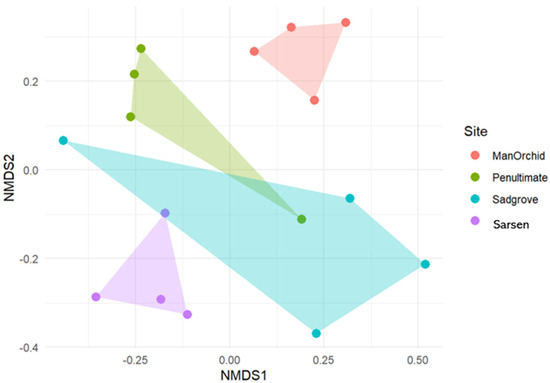 As for the Beta-Diversity analyses, the overall PERMANOVA showed a significant difference in OTU composition between sites (p = 0.001, R2 = 0.36). Pairwise analyses indicated that Sarsen Meadow was the most diverse, showing potentially significant differences with Man Orchid Meadow, Penultimate Meadow, and Sadgrove Plot. Sarsen Meadow exhibited the highest overall diversity, while Man Orchid Meadow showed the lowest for Basidiomycota fungi, especially mycorrhizal/mutualistic fungi (Figure 3). The visual representation via NMDS confirmed these trends (3D Stress = 0.11), with Sarsen Meadow clearly separated from the other sites, while Penultimate Meadow and Sadgrove Plot appeared more similar.