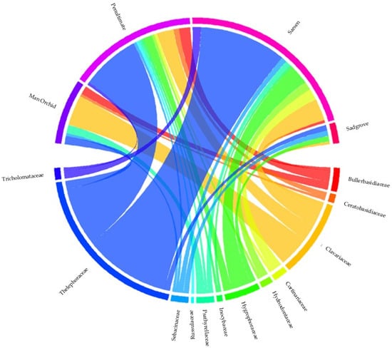 Additionally, the distribution and frequency of OTUs from selected fungal families were examined to identify those shared among sampling areas. Specifically, OTUs belonging to families previously reported in orchid-associated sites through metabarcoding analyses were selected. The matrix of presence/absence was thus plotted in R environment using the packages ‘tidyverse’ and ‘circlize’.