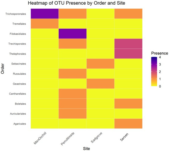The distribution of Basidiomycota OTUs across sites was further compared by creating a presence/absence matrix, wherein relative abundances were converted to binary values (0 for 0% and 1 for >0%). Only OTUs identified to the Order level were retained for this analysis. The presence/absence data for each subsite were summed to indicate the frequency of detection for each OTU at a given site, resulting in values ranging from 0 to 4. These data were visualized using R packages such as ‘tidyverse’, ‘ggplot2’, and ‘viridis’ to produce a heatmap representing fungal frequency in soil samples.