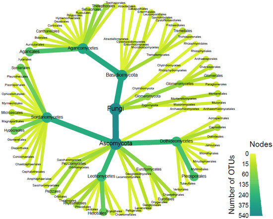 When data from all four sites were combined to evaluate the distribution and abundance of fungal orders, the resulting heatmap depicted the overall totals for the restored habitats at the Grays Gorge site in Essex. Among the Ascomycota, the order Pleosporales contained the highest number of OTUs. However, across all fungal orders, Agaricales exhibited the greatest number of OTUs (Figure 5 and Figure 6). Several orchid-associated mycorrhizal orders, including Cantharellales, Sebacinales, and Thelephorales, were represented by numerous OTUs.