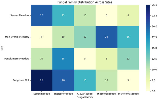 Five fungal families Sebacinaceae, Thelephoraceae, Clavariaceae, Hygrophoraceae, and Psathyrellaceae, across the four meadow sites showed that Sadgrove Plot and Sarsen Meadow exhibit the highest diversity and abundance (Figure 7). A detailed analysis by including more mycorrhizal and mutualistic families show that Sadgrove Plot hosted more fungal families in greater abundance compared to other sites (Figure S1).