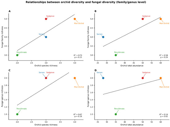 Relationships between orchid diversity and fungal diversity (family and genus levels) Sarsen Meadow, Man Orchid Meadow, Penultimate Meadow, and Sadgrove Plot. (A) Scatterplot showing the relationship between orchid species richness and fungal family richness, (B) Relationship between orchid total abundance and fungal family richness, (C) Relationship between orchid species richness and fungal genus richness, (D) Relationship between orchid total abundance and fungal genus richness. Dashed lines show regression fit with R2 and p-values.