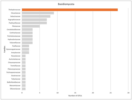 The heatmap showing Spearman correlations between dominant fungal orders and the environmental gradient across sites. Fungal order tends to increase in abundance with more sparse or shrubby vegetation, showing a positive correlation (Figure S2) while fungal orders are more abundant in open or shaded grassland showing a negative correlation. Following the Kruskal–Wallis test, the p-values indicate whether the abundance of each fungal order differs significantly across sites (Table S2). Agaricales, Thelephorales, Sebacinales, and Glomerales showed significant differences. Cantherellales was missing from the top ten as the detectable amounts in soil are low but included in further analysis as showing in Figure S3. The heatmap presented in Figure 4 illustrates the distribution and frequency of selected OTUs from Basidiomycota, specifically those for which sequencing analyses permitted identification at the family level.