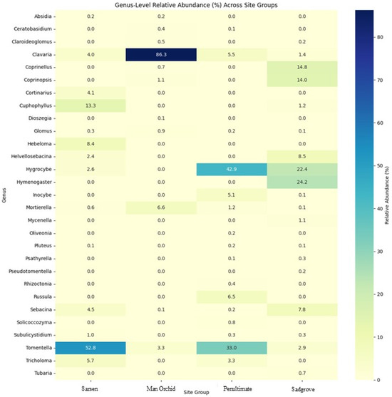 Figure 10 and Figure S5 displays the distribution and relative abundance of different key genera. Clavaria, Tomentella, and Hygrocybe are the most abundant genera of either mycorrhizal or mutualistic functions recorded from all sites. Of these, Clavaria was in very high abundance in the Man Orchid Meadow, while Tomentella was in high abundance in both Sarsen and Penultimate Meadows. Sadgrove Plot hosted Hygrocybe and Hymenogaster in relatively high abundance.