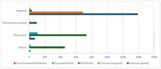 Diversity of orchids and number recorded in 2024 at Sarsen Meadow, Man Orchid Meadow, Penultimate Meadow, and Sadgrove Plot in Grays Gorge.