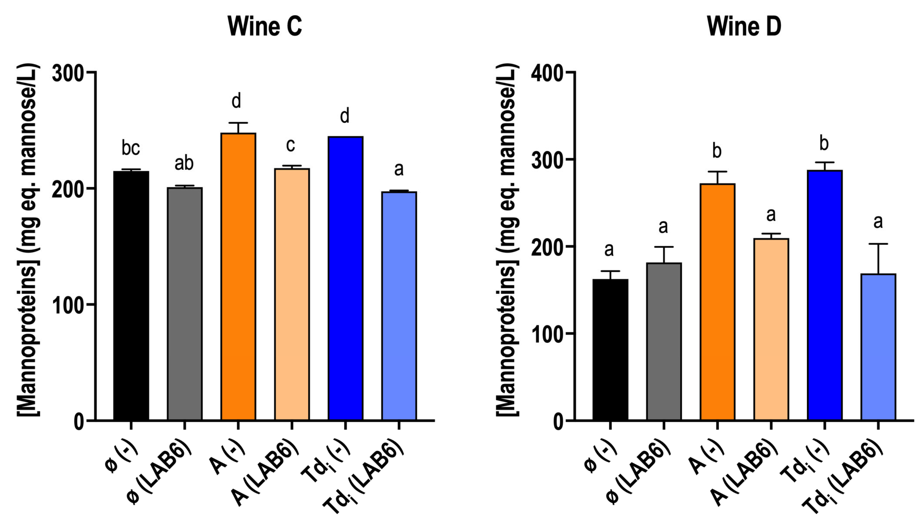 - Balmaseda, A.; Aniballi, L.; Rozès, N.; Bordons, A. Use of Yeast Mannoproteins by Oenococcus oeni during Malolactic Fermentation under Different Oenological Conditions. Foods 2021, 10, 1540. [Google Scholar] [CrossRef] [PubMed]