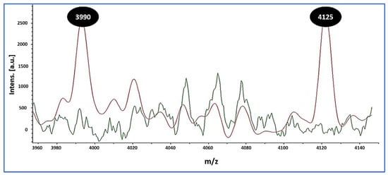 In parallel, MALDI overlays revealed two reproducible low-mass peaks at m/z 3990 and 4125 that were present in all MRSA isolates (10/10, 100%) and absent in all MSSA isolates (0/24, 0%) (Figure 1). These signals were used strictly for preliminary triage. Final MRSA designations relied on cefoxitin-based screening with mecA/mecC confirmation, as detailed in the Methods.