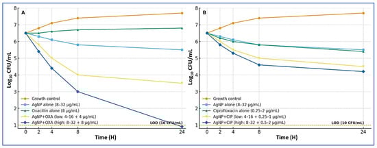 Time–kill kinetics of AgNP combinations against MRSA. (A) AgNPs with oxacillin. Curves show the growth control, AgNPs alone (8–32 µg/mL), oxacillin alone (8 µg/mL), and two combination regimens: low dose (AgNPs 4–16 µg/mL plus oxacillin 4 µg/mL) and high dose (AgNPs 8–32 µg/mL plus oxacillin 8 µg/mL). The high-dose combination produced rapid, sustained bactericidal activity, with some isolates reaching the limit of detection (LOD; 10 CFU/mL, dashed line) by 24 h. (B) AgNPs with ciprofloxacin. Curves show the growth control, AgNPs alone (8–32 µg/mL), ciprofloxacin alone (0.25–2 µg/mL), and two combination regimens: low dose (AgNPs 4–16 µg/mL plus ciprofloxacin 0.25–1 µg/mL) and high dose (AgNPs 8–32 µg/mL plus ciprofloxacin 0.5–2 µg/mL). Combinations showed additive-to-synergistic killing without evidence of antagonism, with an earlier onset of killing (4–8 h) and reduced regrowth compared with single agents.