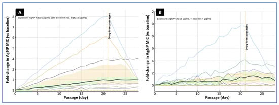 Experimental evolution of foodborne MRSA under sub-MIC AgNP exposure. (A) AgNP alone. Ten isolates were serially passaged for 20 days in cation-adjusted Mueller–Hinton broth (CAMHB) containing AgNPs at 4, 8, or 16 µg/mL, matched to baseline AgNP MICs of 8, 16, or 32 µg/mL, respectively. (B) AgNP plus β-lactam. Parallel passages used AgNPs at 4, 8, or 16 µg/mL together with oxacillin at 4 µg/mL. Curves display individual isolate trajectories (thin lines) as fold-change in AgNP MIC relative to baseline; the bold line indicates the median, with the shaded band showing the interquartile range (IQR). The vertical dotted line at day 21 marks the start of drug-free passages. Under AgNP exposure alone, several isolates showed multi-fold MIC increases with partial regression during drug-free culture, whereas the AgNP–oxacillin combination constrained MIC drift.