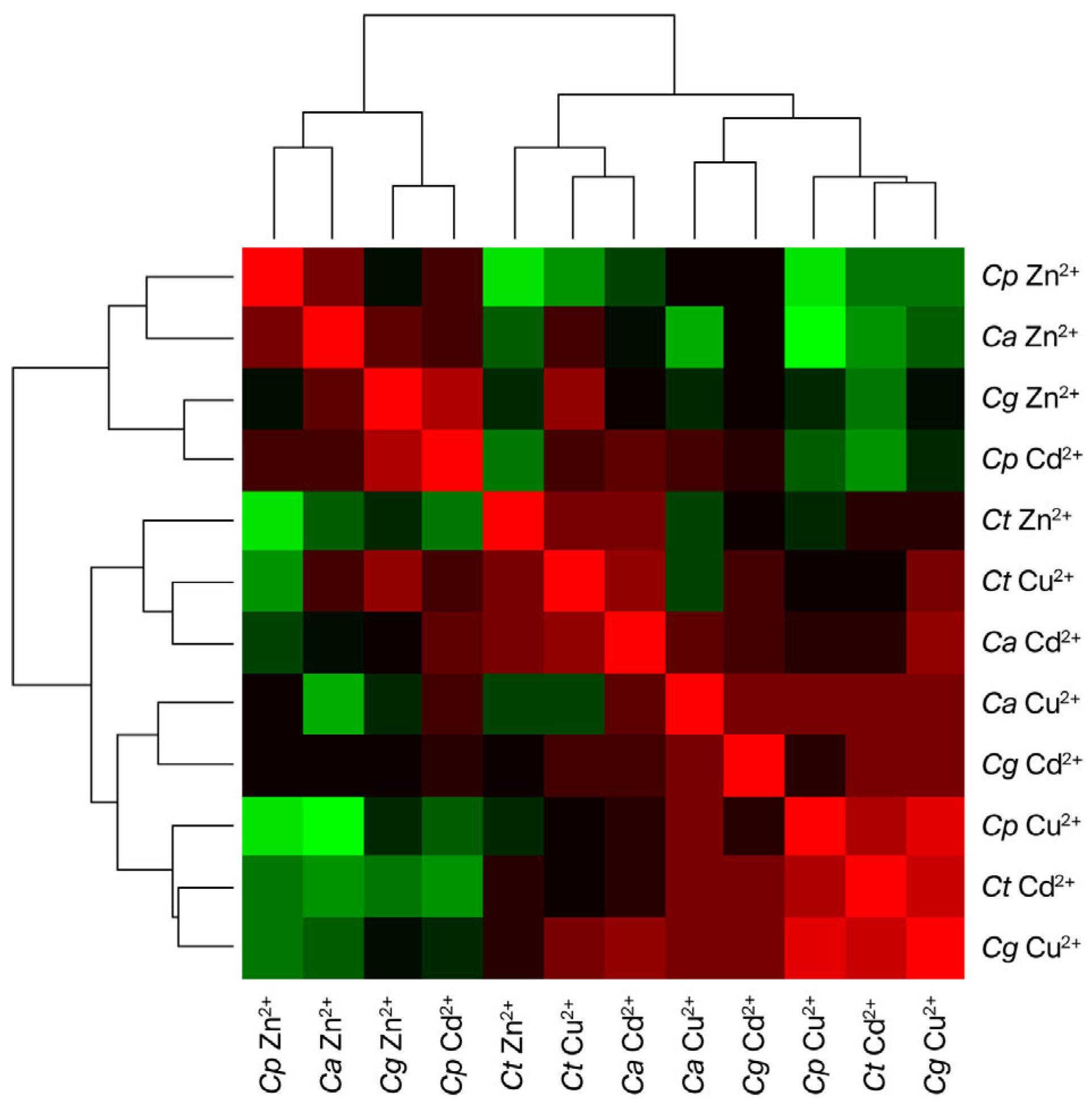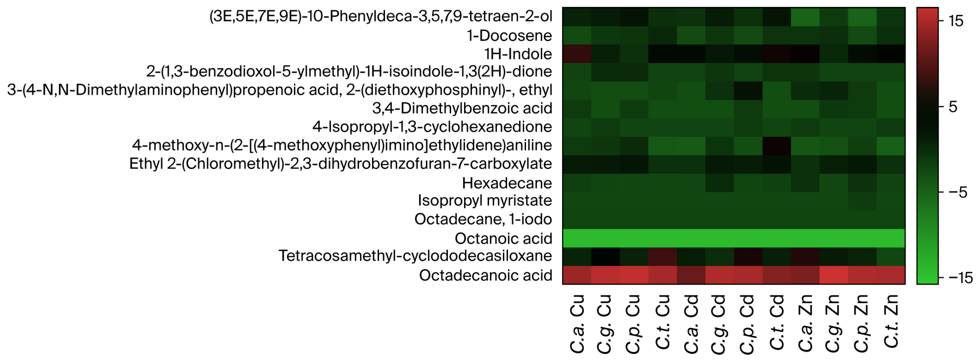 Figure 3. Heatmap depicting the fold change values (ranging from −15 to 15) for metabolite production higher than 2 times compared to non-exposed cultures. There are 15 metabolites shared among Candida spp. strains exposed to Zn2+, Cd2+ and Cu2+. The red color indicates a higher fold change in expression, whereas colors closer to green represent lower fold change. The strains include Candida albicans (C.a.), Candida glabrata (C.g.), Candida tropicalis (C.t.) and Candida parapsilosis (C.p.).