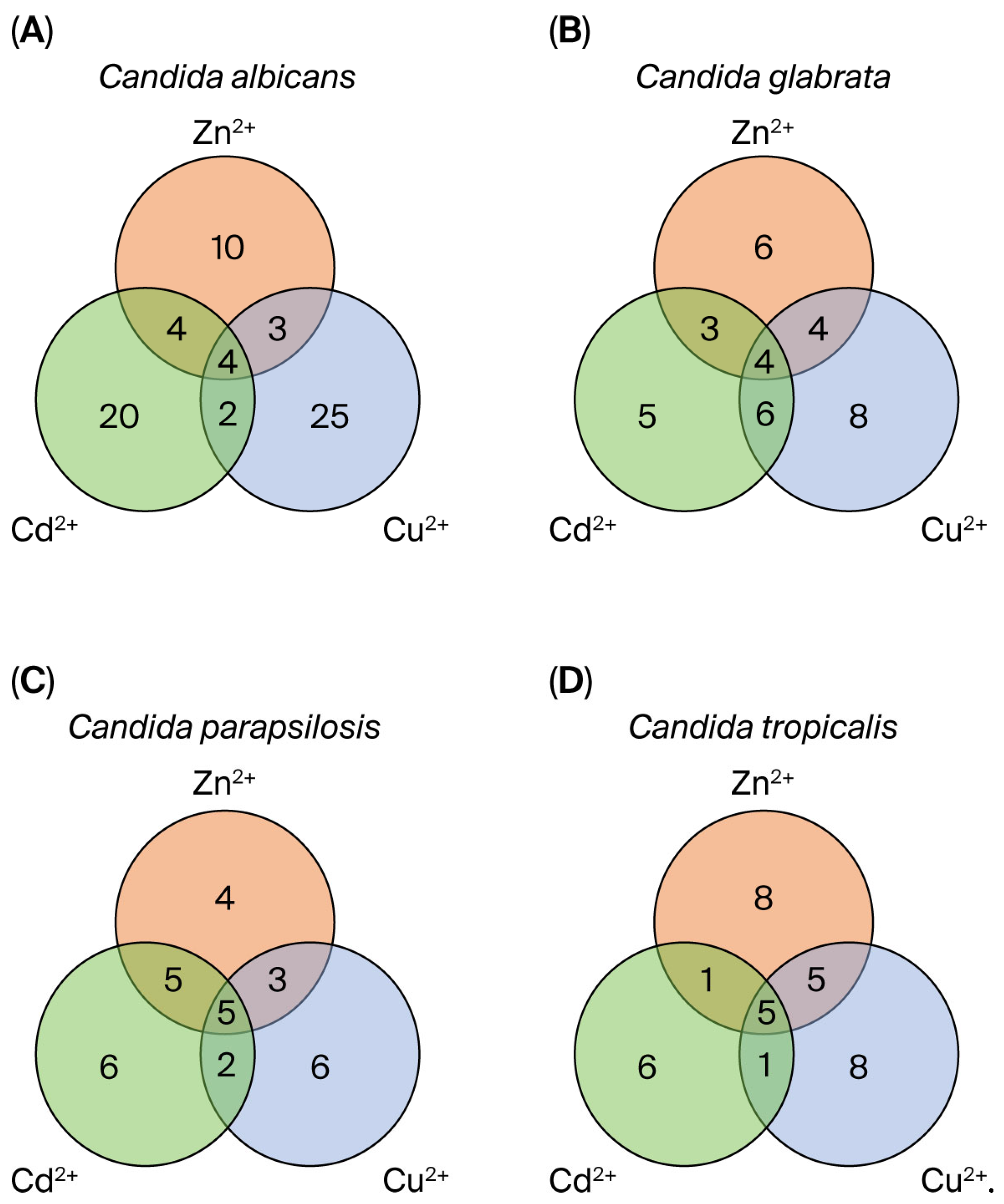 Figure 5. Venn diagrams illustrating metabolites identified in each Candida strain following exposure to heavy metals. Metabolites expressed by Candida albicans (A), Candida glabrata (B), Candida parapsilosis (C) and Candida tropicalis (D) when heavy metals (Zn2+, Cu2+ and Cd2+) were added to the culture medium. The diagrams were generated using the Venny tool, at https://jvenn.toulouse.inrae.fr/app/example.html (accessed on 1 June 2025).